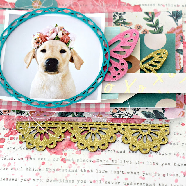 To finish off my layout I added a 'Mini #Word - Selfie' to my smaller cluster along with two 'Asst Arrows'. I painted one arrow the same blue as the title. I then covered the other arrow and #selfie with more black glossy accents.